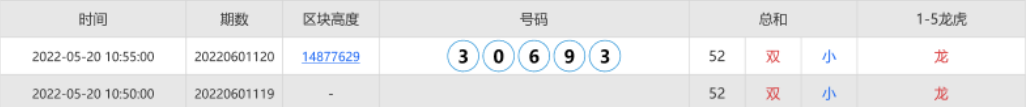 如果00:05:00这一期的开奖数据在00:05:00~00:09:59没有生成区块高度,这一期为无开奖数据;如果区块高度生成在00:10:00,则属于下一期的开奖数据。